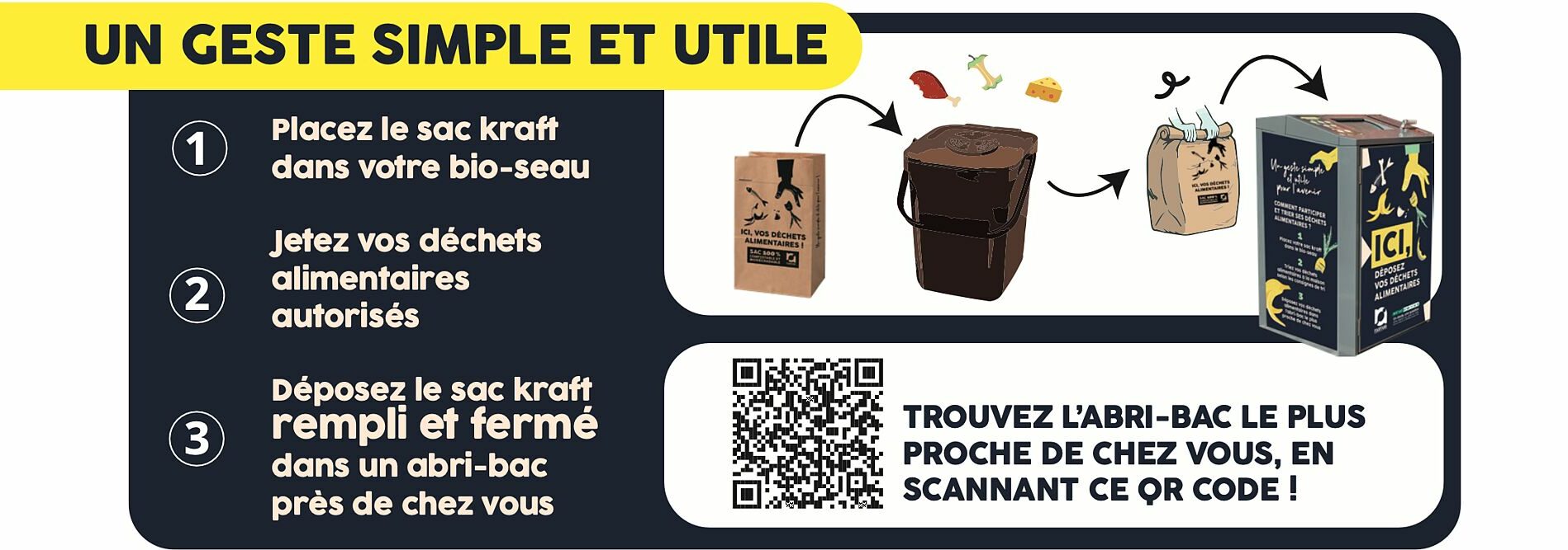 Les biodéchets collectés dans ce bio-sceau doivent ensuite être déposés dans le PAV spécifique aux déchets alimentaires, situé à côté des colonnes à verre.